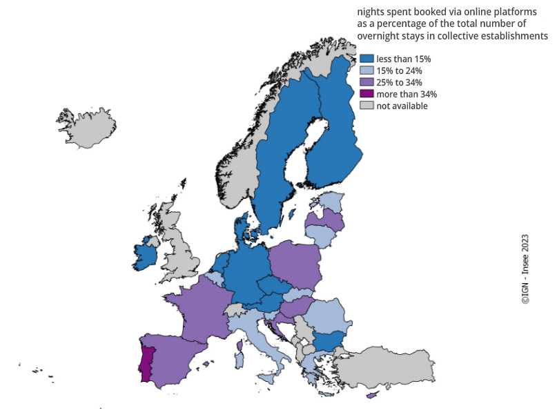 Reading note: in France, in 2022, nights spent in short-stay accommodation booked via online platforms accounted for between 24% and 35% of all nights spent in collective accommodation establishments.