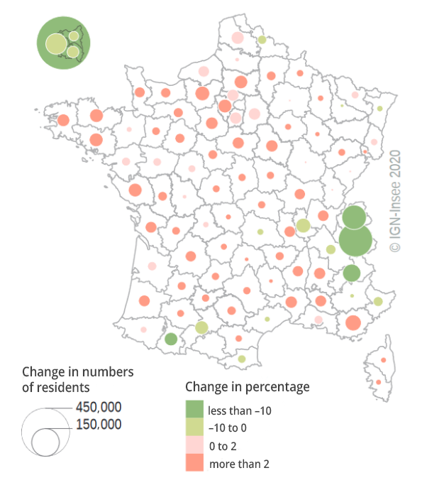 Interpretation: during the lockdown, in addition to the departure of foreign visitors and residents from the French overseas departments, Paris saw its present population decrease by 450,000 people (a 20% drop). This population decline was due to non-residents of the capital returning home and Parisians leaving the city.